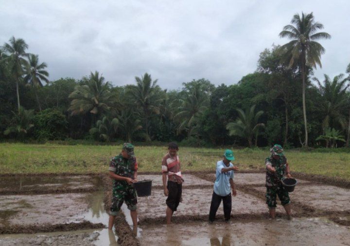 Batang Angkola – Bintara Pembina Desa (Babinsa) Koramil 11/BA Kodim 0212/Tapsel Serda AK. Daulay dan Kopda Jefri melaksanakan pendampingan kepada petani menabur benih Padi varietas Mekongga di lahan sawah milik Kelompok Tani Semusim dai areal Persawahan Saba Paya Sordang Kelurahan Pintu Padang II Kecamatan Batang Angkola Kabupaten Tapanuli Selatan, Senin (06/04/2024)