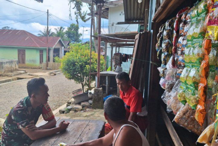 Tambangan – Babinsa Koramil 14/Kotanopan Kodim 0212/Tapsel Pratu Sahala Poster Sirait melaksanakan kegiatan monitor wilayah dan Komsos bersama warga di wilayah desa binaan di desa Angin Barat Kecamatan Tambangan Kabupaten Mandailing Natal, Senin (13/05/2024)