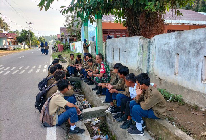 Babinsa Koramil 20/Batahan Himbau dan Ajak Anak Sekolah Tidak Jajan dan Buang Sampah Sembarangan - KODIM 0212/TAPSEL
