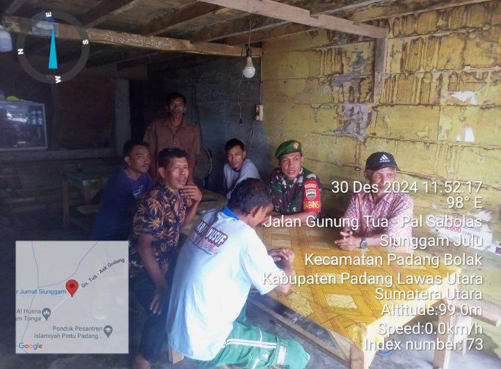 Padang Bolak Tenggara – Babinsa Koramil 05/PB Kodim 0212/Tapsel Serda Zulhelmi Daulay melaksanakan kegiatan komunikasi sosial (Komsos) dengan warga masyarakat di Desa Siunggam Julu Kecamatan Padang Bolak Tenggara Kabupaten Padang Lawas Utara, Senin (30/12/2024)