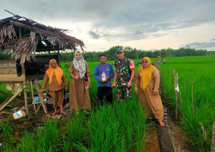 Natal – Babinsa Koramil 17/Natal Kodim 0212/Tapsel Praka Anafoli Laoli bersama PPL melaksanakan kegiatan pendampingan kepada petani melakukan penyemprotan hama tanaman padi sawah di Desa Bonda Kase Kecamatan Natal Kabupaten Mandailing Natal, Senin (27/01/2025)