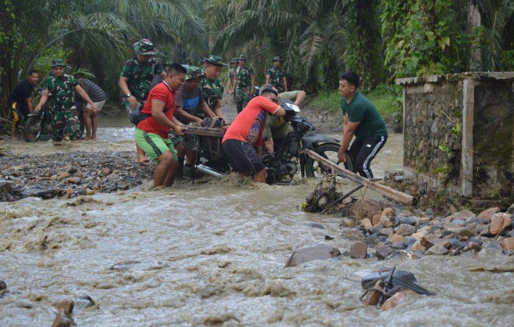 Saat hendak menuju sasaran TMMD, mereka bertemu dengan seorang warga yang hendak ke kebun yang juga hendak menyeberang tetapi ragu-ragu. Warga tersebut tampak kesulitan untuk menyeberang. Tanpa ragu dan dengan penuh kepedulian, anggota Satgas TMMD segera mengambil inisiatif untuk membantu dengan beramai ramai menggendong sepeda motor tersebut dan membantunya sampai ke seberang dengan aman