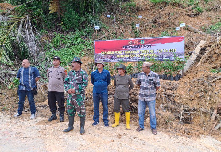 Sosopan – Dalam rangka menjaga kelestarian lingkungan serta turut sukseskan program kegiatan TNI Manunggal Membangun Desa (TMMD) ke-123, Koramil 07/Sosopan Kodim 0212/Tapsel dipimpin langsung Danramil Kapten Inf U. Simatupang bersama Pemerintah Kecamatan dan komponen masyarakat menggelar kegiatan penghijauan penanaman pohon, bertempat di Desa Huta Baru Sosopan dan Desa Simartolu Kecamatan Sosopan Kabupaten Padang Lawas, Jumat (21/02/2025)