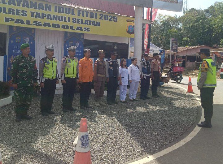 AngkolaTimur – Babinsa Koramil 18/Pargarutan Kodim 0212/Tapsel Sertu M. Irsan dan Koptu Asep Elsi bersama personel gabungan dari instansi terkait melaksanakan pengamanan arus mudik dan arus balik lebaran di Pos Pelayanan Idul Fitri 1446 H/2025 M di Pos Pelayanan Palsabolas Kecamatan Angkola Timur Kabupaten Tapanuli Selatan, Kamis (03/04/2025)