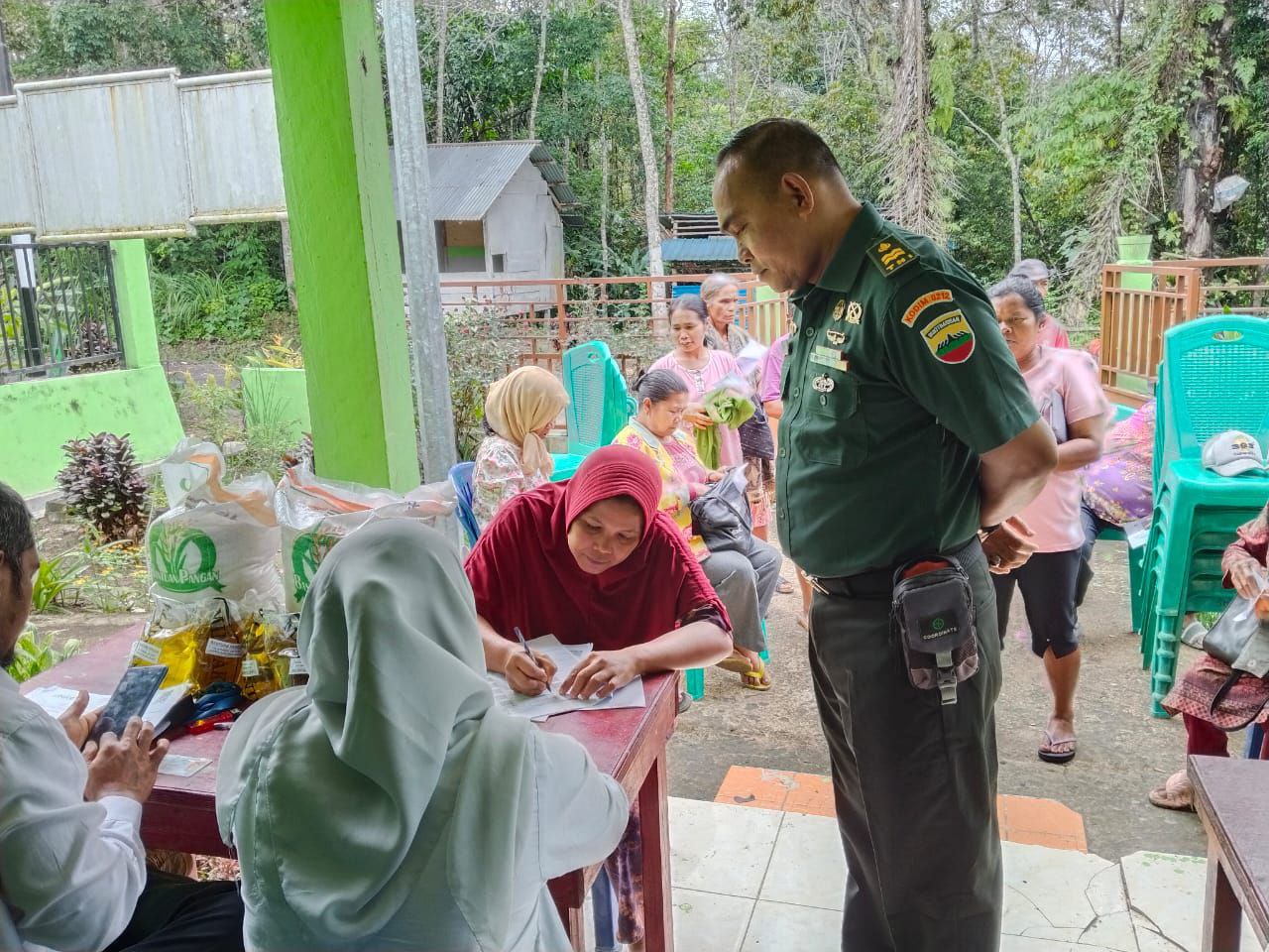Saipar Dolok Hole — Babinsa Koramil 04/SDH Kodim 0212/Tapsel Peltu Nanang Suprianto melaksanakan kegiatan pendampingan penyaluran bantuan pangan kepada warga Keluarga Penerima Manfaat (KPM) di Desa Simangambat Kecamatan Saipar Dolok Hole Kabupaten Tapanuli Selatan, Kegiatan berlangsung di kantor Desa Simangambat, Rabu (10/12/2025)