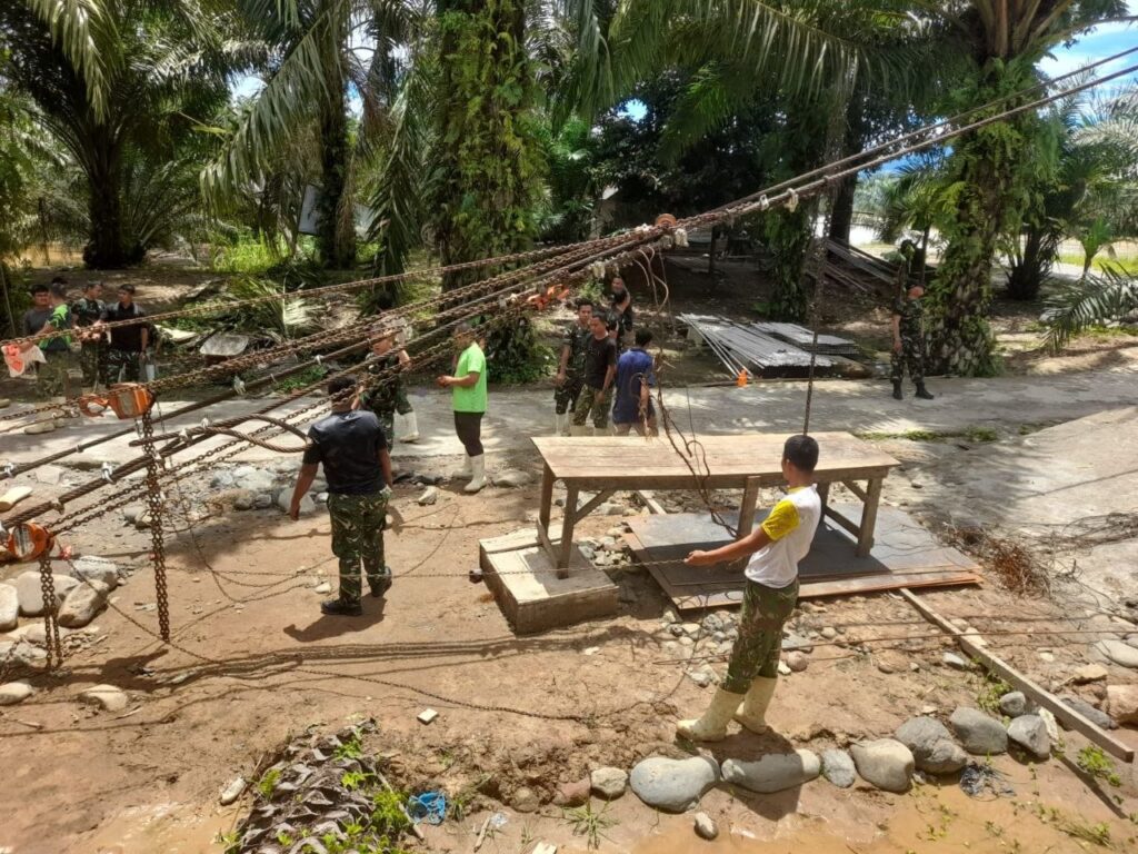 Muara Batang Toru – Babinsa Koramil 01/Batang Toru Kodim 0212/Tapsel Serda Khairul Batubara melaksanakan pemantauan progres percepatan pembangunan Jembatan Gantung Garuda yang berlokasi di Desa Bandar Hapinis Kecamatan Muara Batang Gadis Kabupaten Tapanuli Selatan, Rabu (08/04/2026)