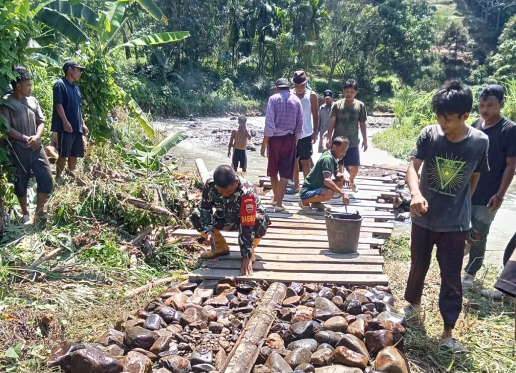 Dalam kegiatan tersebut, Babinsa bersama warga melakukan perbaikan dan penimbunan jalan serta jembatan kayu sebagai sarana penyeberangan di sungai