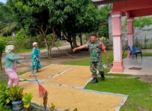 Sihapas Barumun – Babinsa Koramil 10/Barteng Kodim 0212/Tapsel kopda Sarbaini Siregar membantu warga desa binaannya menjemur padi...